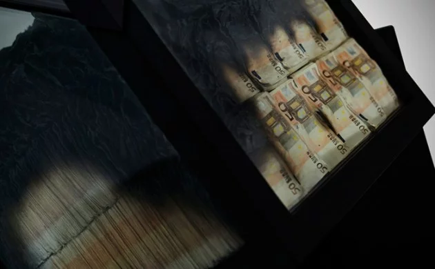 Designer esstisch mit Feuerstelle banknoten dollar yens euro