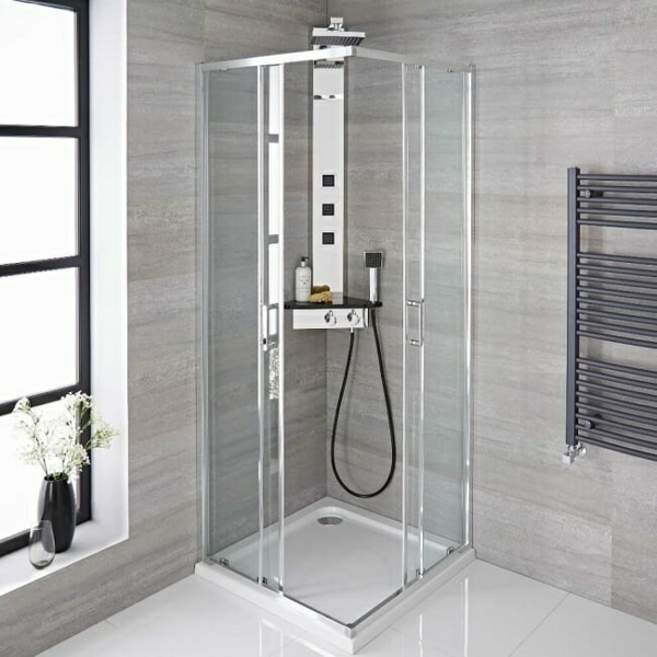 Die Eckdusche ist der ungeschlagene Champion im Platzsparen. Die eigentliche Magie liegt hier aber in der Wahl der Tür.