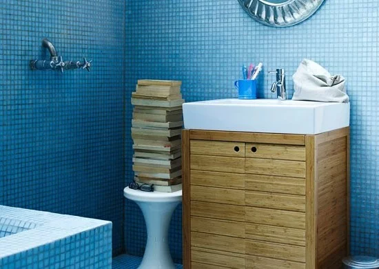 Waschbecken mit unterschrank holz wandspiegel bücher