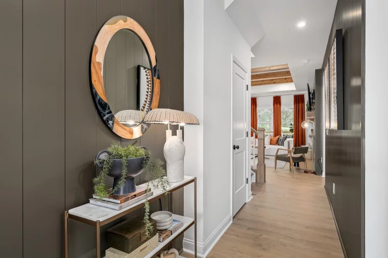 Moderner Schminktisch mit rundem Spiegel und Dekoration