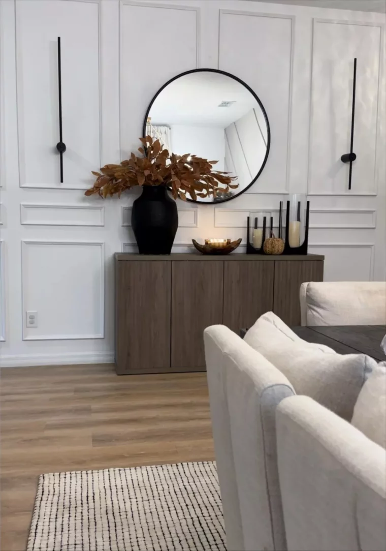Moderner Schminktisch mit rundem Spiegel und Dekoration