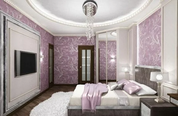Wohnideen lila schlafzimmer dekorative decke bett kronleuchter