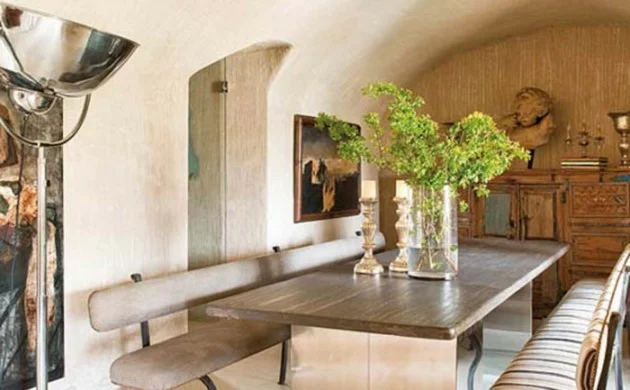 Esszimmer einrichten ideen rustikale elemente pflanzen sitzbank