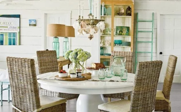 Esszimmer landhausstil rattanmöbel und runder esstisch