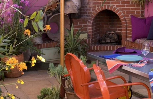 Frische farben im garten lila schattierung zarte blumen orange stühle