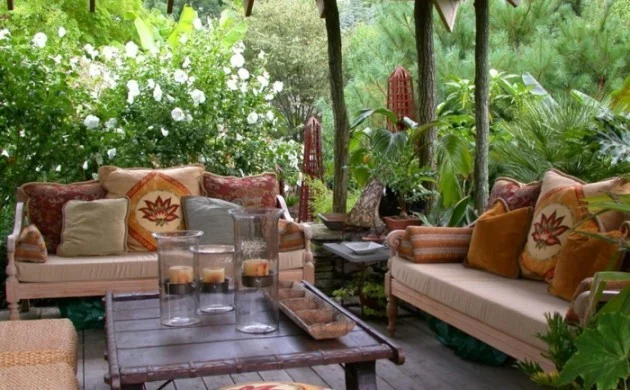 Garten gestalten bilder gartenideen dekokissen gemutlich kerzen holztisch
