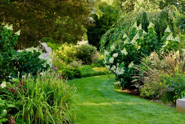 Gartengestaltung Ideen - grüner Rasen Sträucher und Steinweg