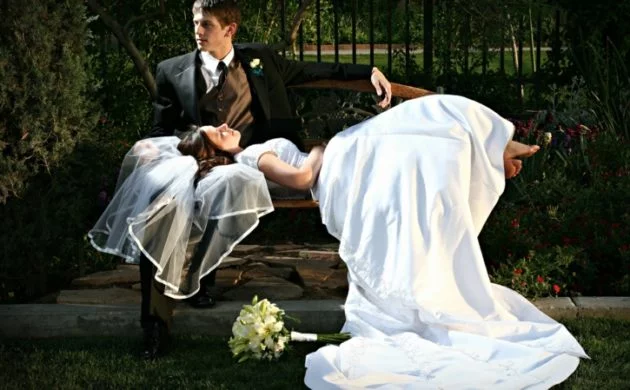 Hochzeitsbilder ideen brautpaar anzug brautkleid auf einer bank brautstrauss