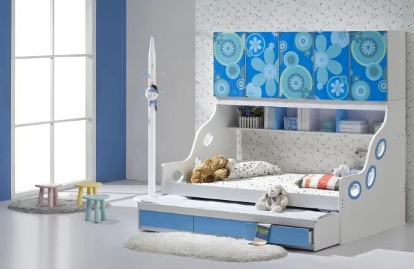 Ausziehbare betten im kinderzimmer blumenmuster wand blau