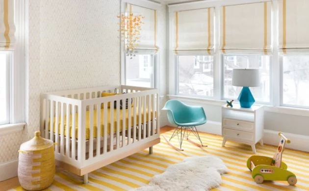 Babyzimmer ideen ausgefallene farbkombinationen streifenteppich schaukelstuhl
