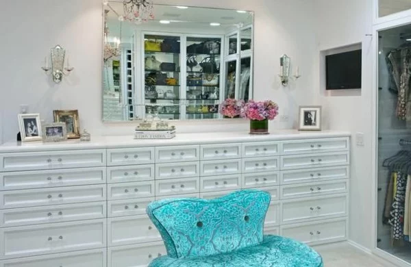 Einrichtungsideen ankleidezimmer möbel elegant holz schrank blauer sessel