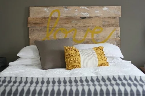 Möbel holzpaletten schlafzimmer kopfteil gelb kissen