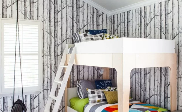 Kinderzimmer teppich hochbett teppichmuster wandtapete