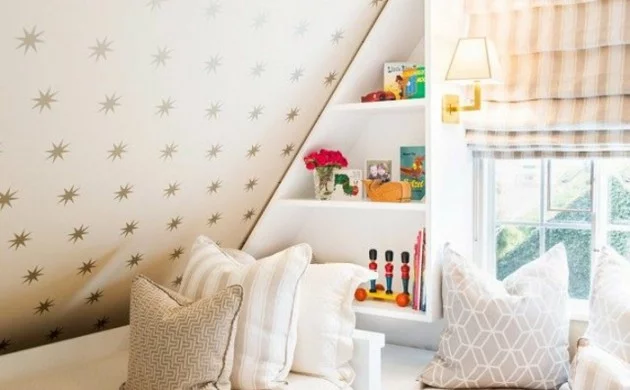 Kinderzimmer mit dachschräge betten dekokissen grafische muster wandregale wandtapete sterne