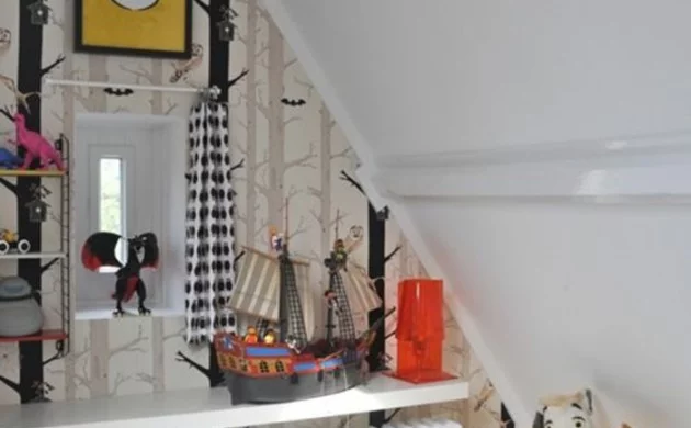 Kinderzimmer mit dachschräge bett heizung plastikstuhl gelb wandregale wanddekoration bäume