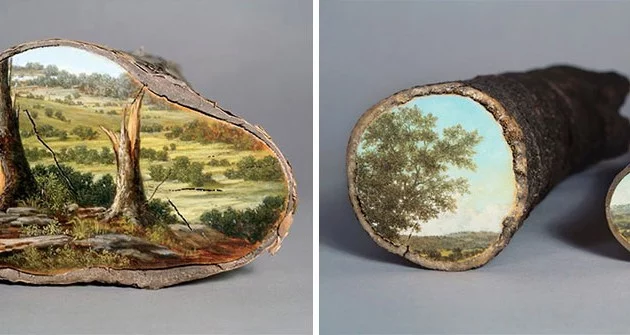Alison Moritsugu schafft Baumstamm Deko. Sie bemalt Baumstämme und Holzblöcke mit lebendigen Landschaftsbildern. Dabei ist ihre Kunst mit keiner Baumfällung verbunden