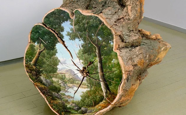 Alison Moritsugu schafft Baumstamm Deko. Sie bemalt Baumstämme und Holzblöcke mit lebendigen Landschaftsbildern. Dabei ist ihre Kunst mit keiner Baumfällung verbunden