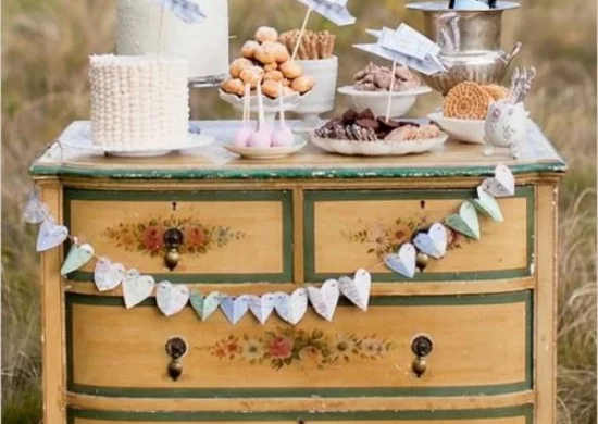 Nachtisch buffet hochzeitsparty deko ideen torte rustikal holz kommode herzen girlande