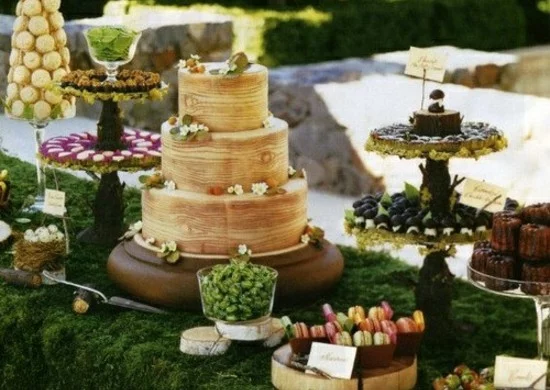 Nachtisch buffet hochzeitstisch dekorieren gartenparty moos tischdecke holzoptik kuchen