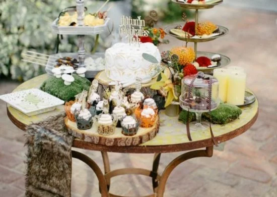 Nachtisch buffet rundtisch holz baumstumpf hochzeitstisch dekorieren gartenparty
