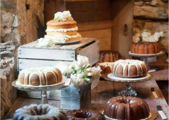 Nachtisch buffet tisch dekorieren landhausstil holztisch steinwand kuchen