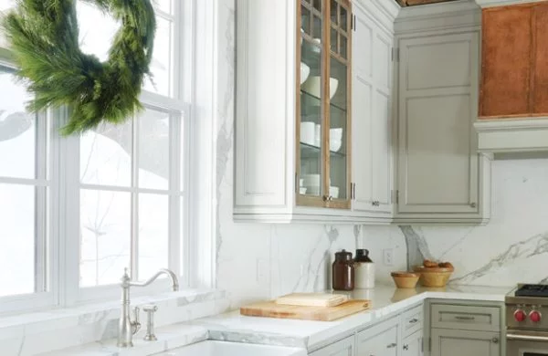 Weihnachten auf dem Lande feiern Kranz am Küchenfenster visueller Unterschied