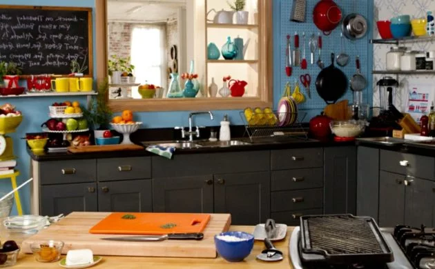 Wohnideen küche hellblaue wand schwarze küchenschränke otrange akzente
