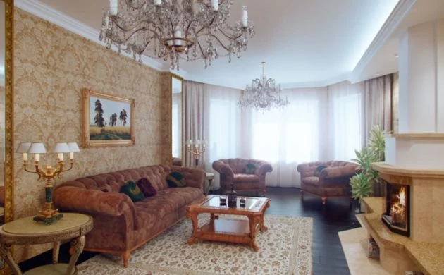 Wohnideen wohnzimmer wandtapete teppichmuster pflanzen schöner leuchter
