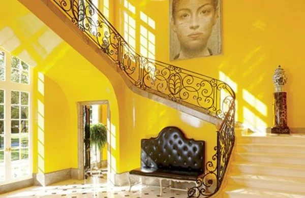 Flur gestalten eingangsbereich antik möbel sessel bodenfliesen wandfarbe gelb