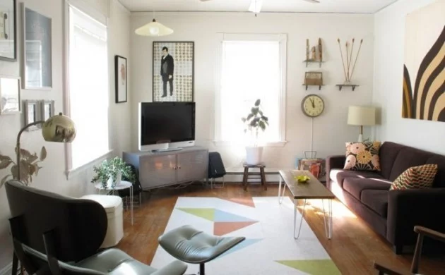 Innendesign eklektisches wohnzimmer geometrischer teppich relaxsessel