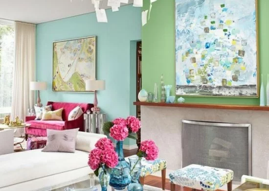 Interior design ideen weiblich wohnzimmer pastelfarben blau grün pink